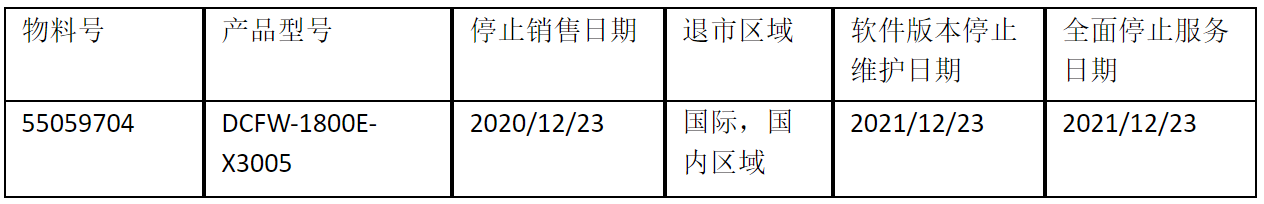 北京神州数码金沙js信息技术有限公司正式通知您, 以上DCFW-1800E-X3005下一代防火墙(55059704)将于2020年12月23号停止接收新的订单(具体日期见上表),不再供货。给您带来的不便,敬请原谅。