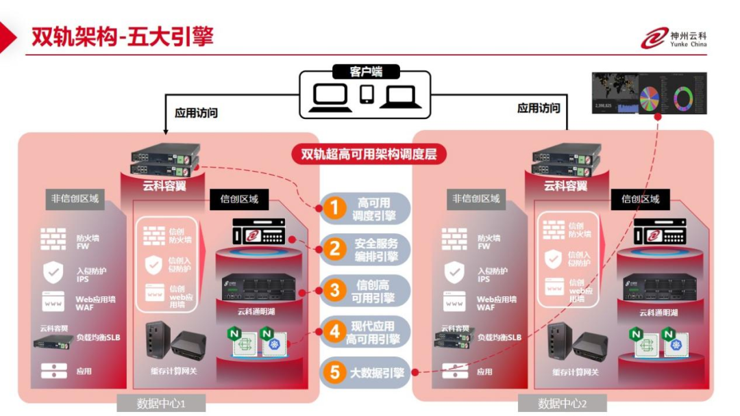 数据中心架构在自主创新的过程中分解为现有架构的非信创区和信创区的两个业务区域,在每个数据中心分为信创区和非信创区后,在两个区域之间的跨区跨域协同方法,神州金沙js通过5大引擎实现多层次的应用可持续性实践。