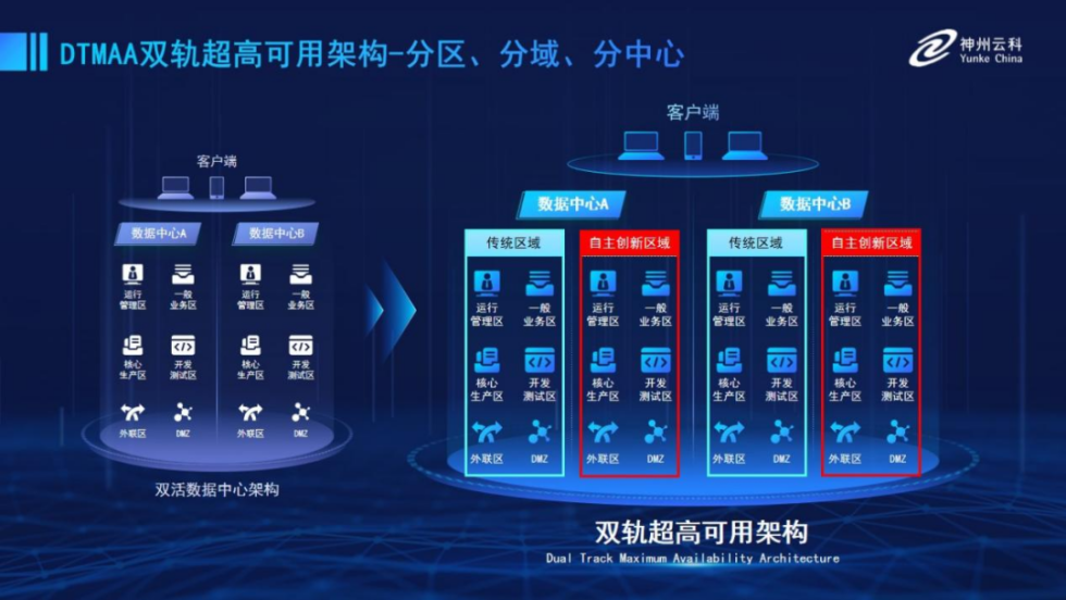 为帮助金融客户更好地应对数字经济时代对可持续性的高要求,实现“信创”与“数字化”齐头并进,神州金沙js推出了双轨超高可用架构。该架构在双活数据中心的分区调度基础上,增加信创域和非信创域的分域调度,实行信创域与传统域应用全量部署,使双中心运营变为双中心四区域并行运行,互为多活,将“0到1”的单轨建设道路变为分区分域协同的多活双轨超高可用架构。帮助客户在新架构下,保障“信创”的同时解决性能瓶颈,提升稳定性,保证应用可持续性,最终实现信创区域和非信创区域的平滑过渡,完成国产化替代目标。